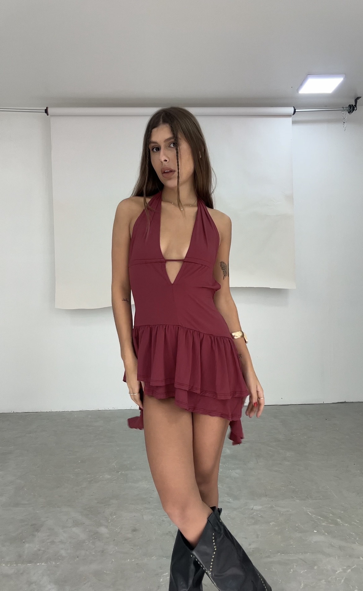 Possui regulagem no busto, tecido duplo, amarração no pescoço e atrás nas costas, modelagem mais curta